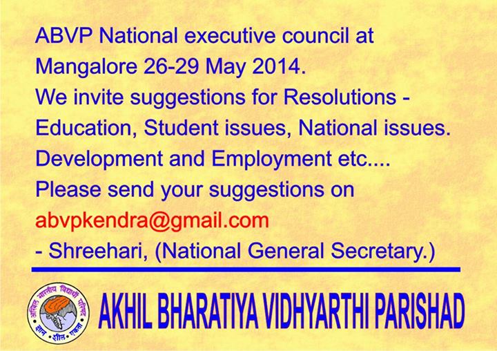 We invite suggestions for Resolutions - Education, Student issues, National issues. Development and Employment etc. Please send your suggestions on abvpkendra@gmail.com